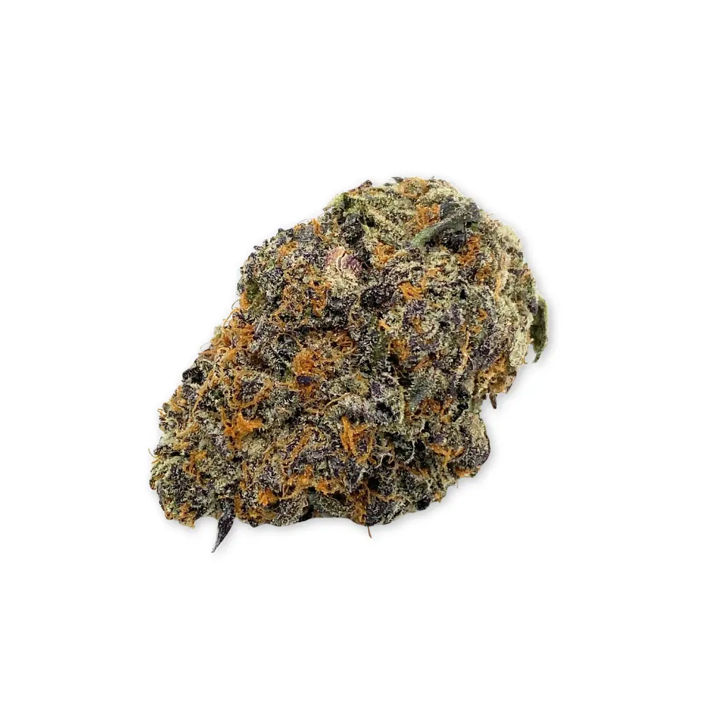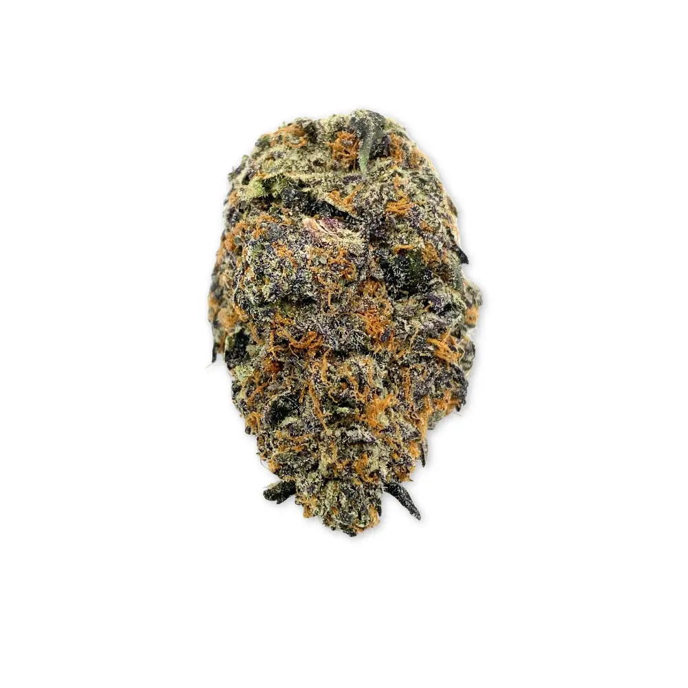 - Visuals: Dense purple buds with icy trichomes and bright orange pistils