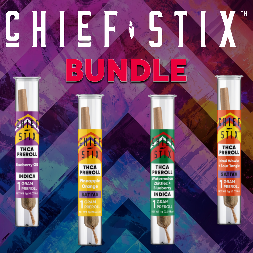 The Chief Stix Prerolls Bundle brings together a premium selection of 1g THCa prerolls featuring Blueberry OG, Pineapple Orange, and Maui Wowie x Sour Tangie. Handcrafted for smooth, flavorful experiences, this bundle delivers variety and quality at an unbeatable value.