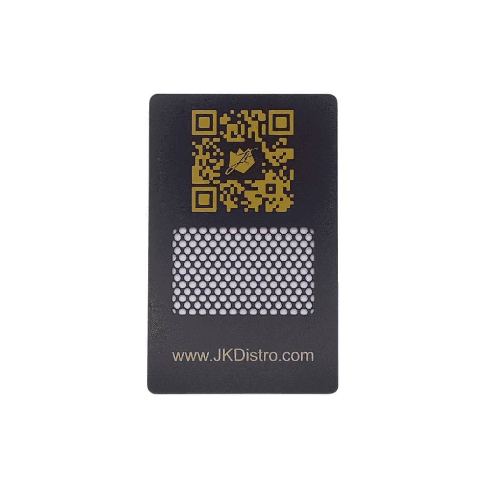 The JK Distro Wallet Grinder is the perfect blend of convenience and style. Crafted from durable metal, this ultra-thin grinder fits seamlessly in your wallet, making it easy to grind anywhere, anytime. The precision mesh surface delivers a consistent grind, while the sleek JK Distro design on the front and a QR code on the back add a touch of style and functionality.