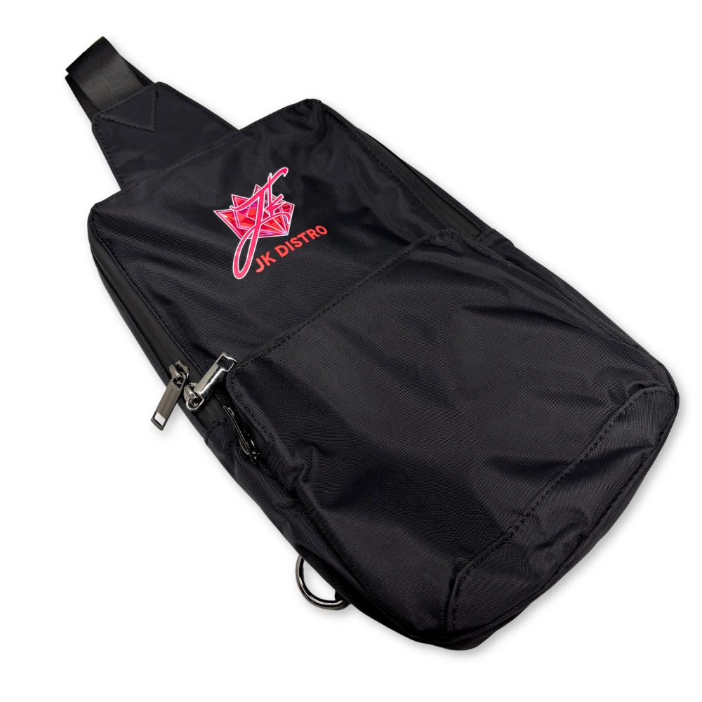 The JK Distro Sling Backpack is designed as practical everyday merch. The compact sling format keeps essentials organized while maintaining a clean, low-profile look. Durable black fabric and subtle branding make it easy to carry anywhere.