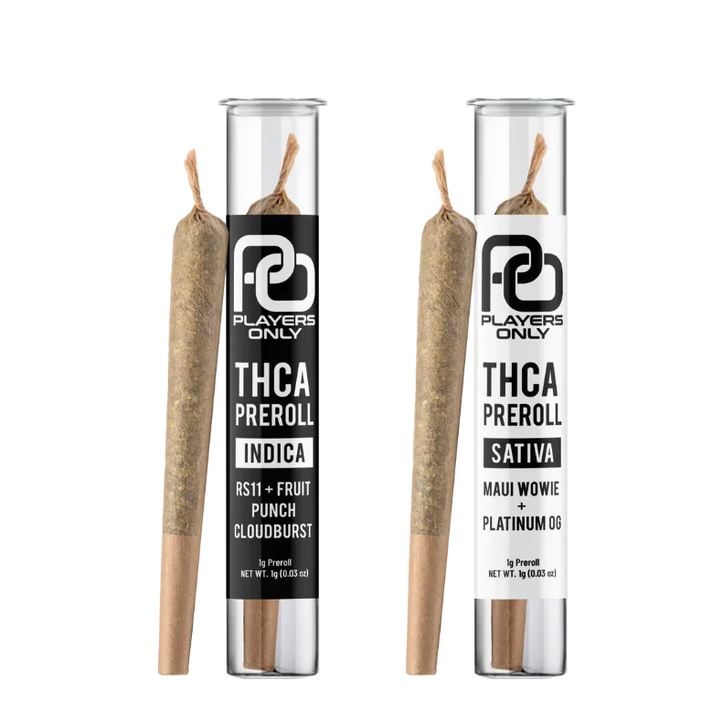 Introducing the Players Only 2ct Preroll Pouch, featuring the perfect marriage of Indica and Sativa strains. Experience the superior hand-rolled perfection and top-notch terpene quality in each preroll. One RS11 + Fruit Punch Cloudburst (Indica) and one Maui Wowie + Platinum OG (Sativa) preroll in each pouch.