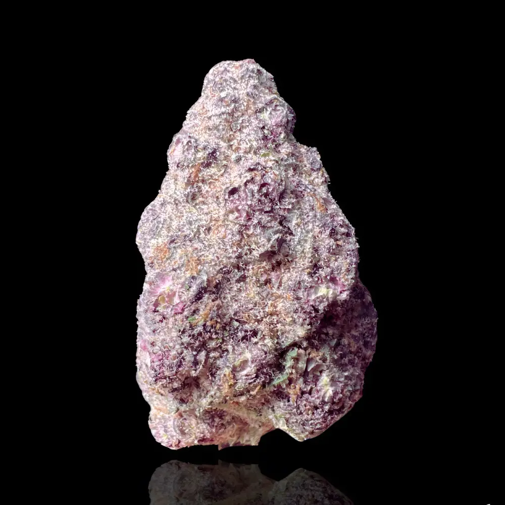 - Bud color: Vivid purple tones intertwined with rich green hues, accented by fiery orange pistils and a thick, frosty layer of white trichomes