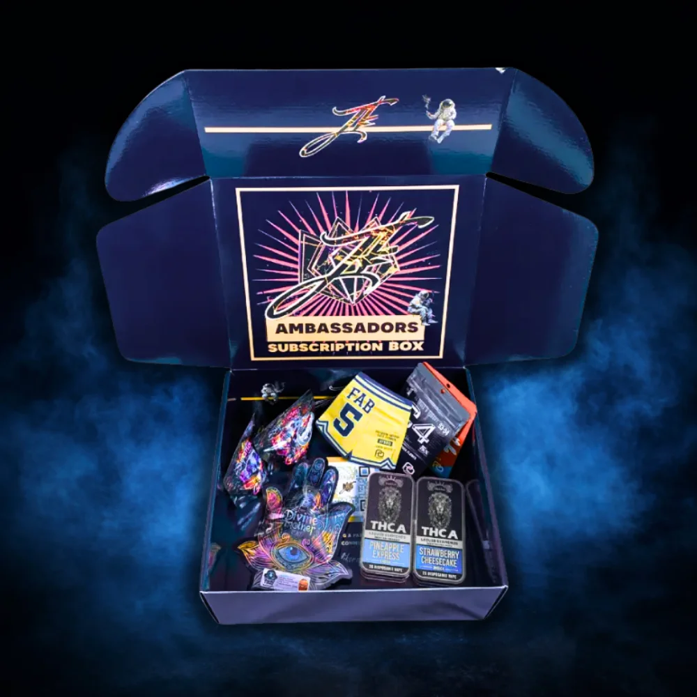 The JK Ambassadors Box is a monthly subscription box containing a curated assortment of hemp-derived products selected from JK Distro’s catalog. Each month, subscribers receive a rotating mix of premium items, designed to mirror the boxes we send to our official brand ambassadors.