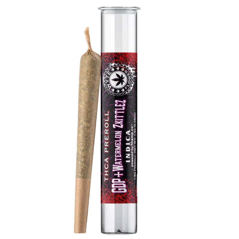This 1.5g “GDP + Watermelon Z” THCA preroll, approved by Lil Wyte, offers a unique blend of terpenes and heavy hits for a long-lasting and potent experience. Made with 100% flower.
